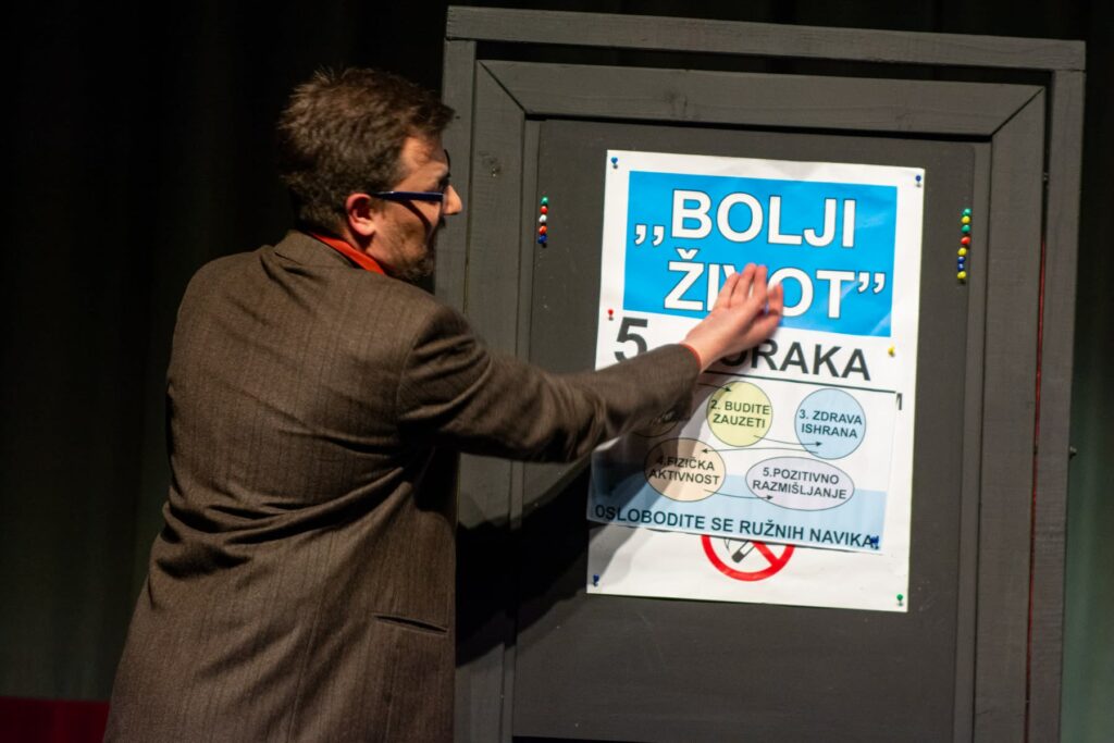 U monodrami „Ka boljem životu u 5 koraka” jedno poučno i korisno predavanje Udruženja „Bolji život”, rutiniranog, ali nadahnutog predavača Ognjena Petra Stankovića, sticajem izuzetnih okolnosti, pretvara se u intimnu ispovest junaka. U ovoj drami pratimo čoveka u poslovično nemogućoj borbi da svoj kašalj prikrije, a svoju zaljubljenost nikada ni sebi ne prizna ̶i što se više trudi, to se sve više otvara pred potpunim neznancima.